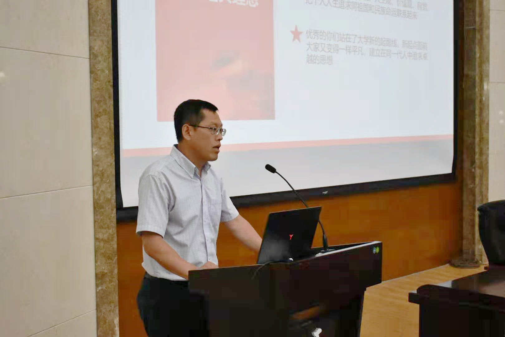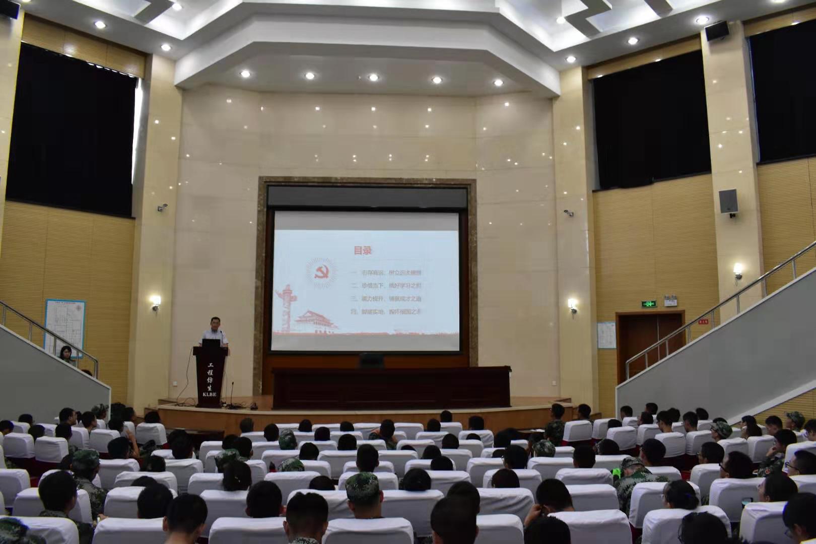 9月4日,在南岭校区仿生楼报告厅,酒店偷拍 党委书记李善兴为全体新生上第一堂党课,勉励新入学学生坚定理想信念,展现青春力量。