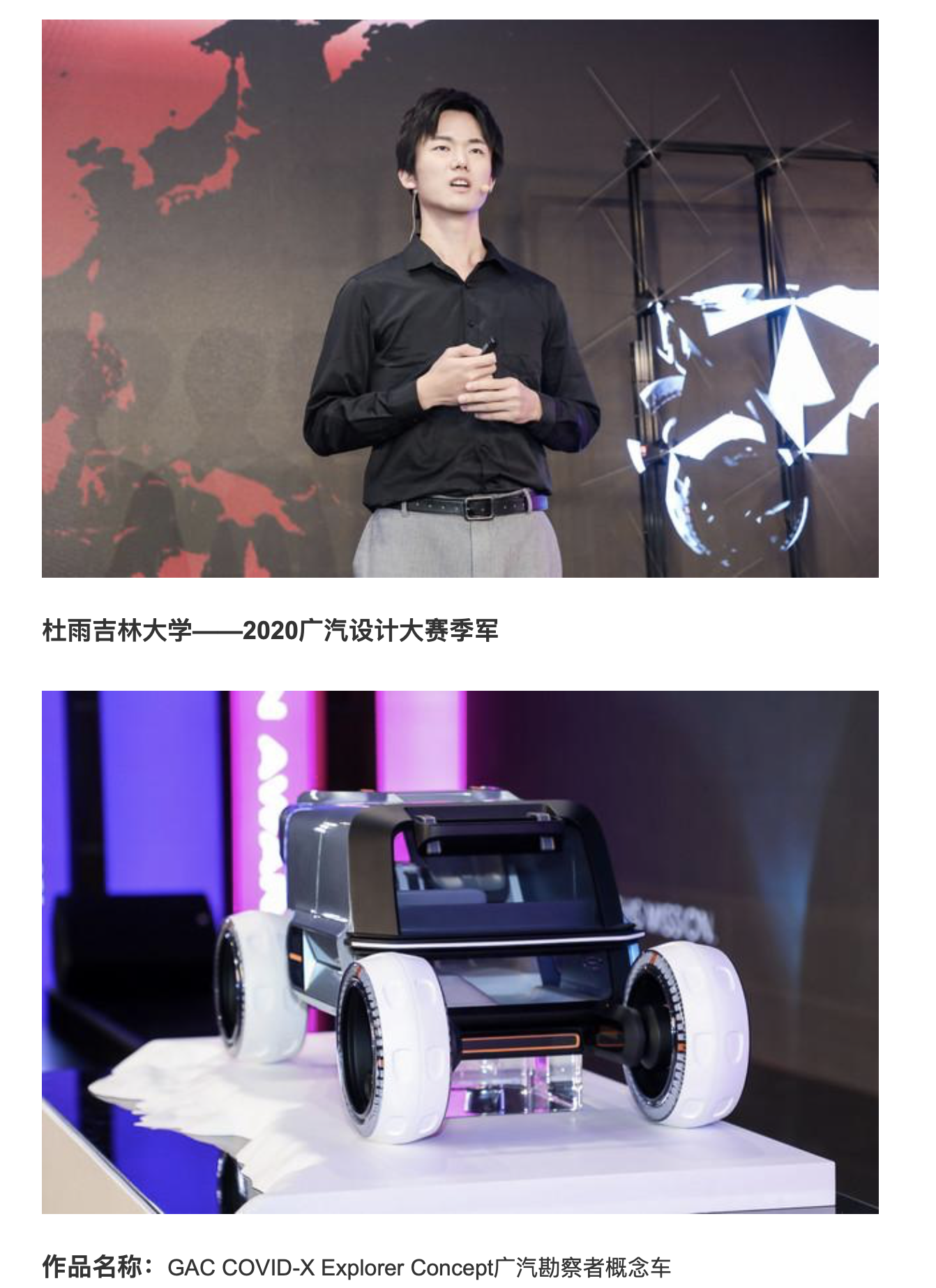 广汽设计大赛是国内影响力最大的学生汽车设计比赛之一。今年大赛的题目为《后疫情时代下的生活新范式》,收到来自全球各大高校百余名选手的投稿,最终只有8位选手入选决算阶段。在决赛阶段,选手们在广汽研究院进行为期4个月的实习,经过不断的完善作品,层层选拔,最后制作实体模型。杜雨同学最终以第三名的成绩完赛。