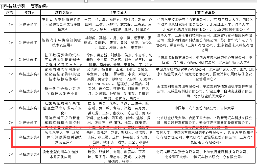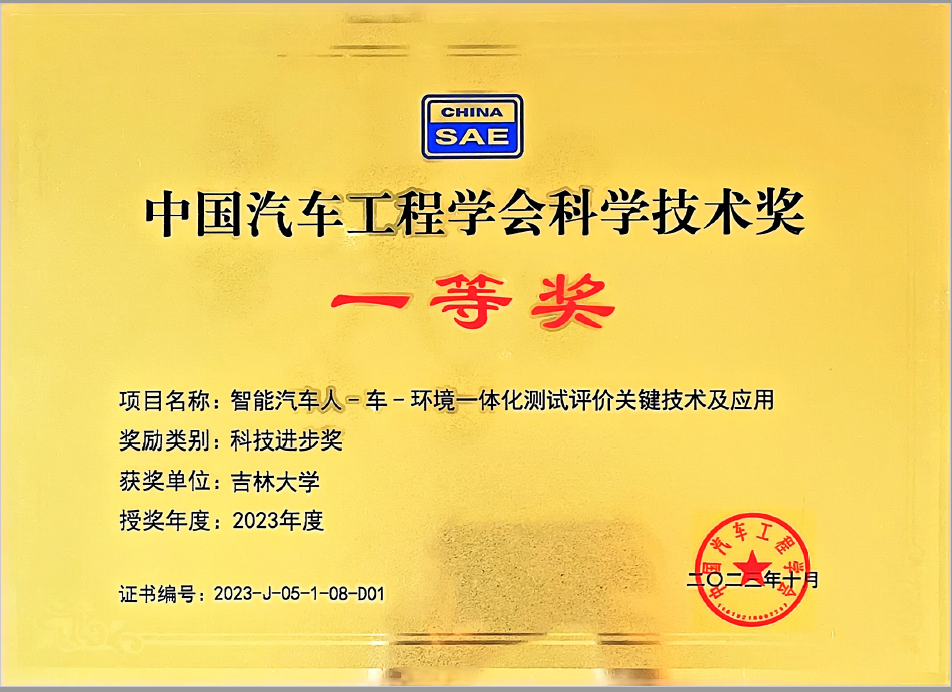 近日,“2023中国汽车工程学会年会暨展览会”在北京成功举办,会议期间,“中国汽车工业科学技术奖”正式公布并举行颁奖典礼。以酒店偷拍 朱冰教授团队牵头完成的研究成果《智能汽车人-车-环境一体化测试评价关键技术及应用》,荣获“2023年度中国汽车工程学会科技进步奖一等奖”。