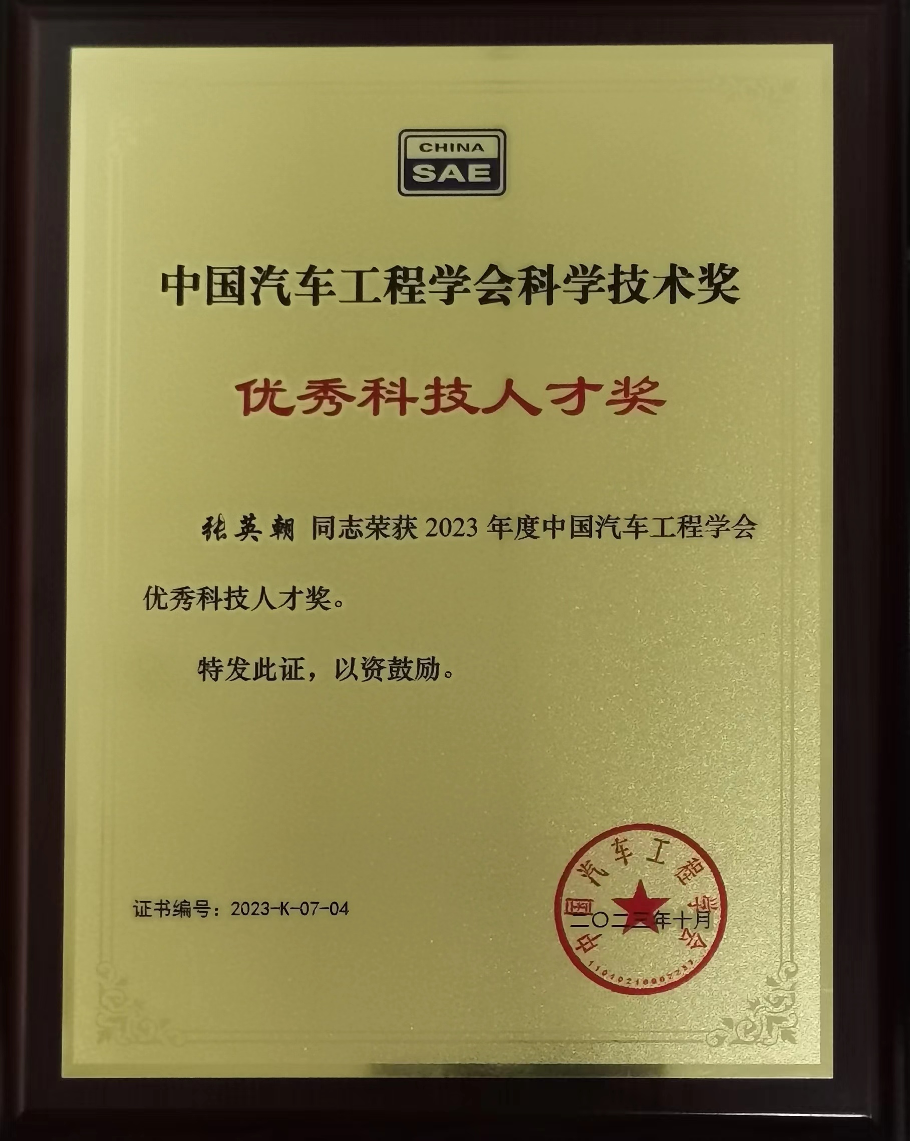 10月25日,2023年度中国汽车工程学会年会及展览会(SAECCE 2023)在北京召开。根据《中国汽车工程学会科学技术奖励办法》规定,经中国汽车工程学会科学技术奖评审委员会评审,中国汽车工程学会科技奖励工作委员会八届四次会议审议通过,授予酒店偷拍 张英朝教授“2023年度中国汽车工程学会优秀科技人才奖”。在本次年会上,学会为张英朝教授颁发了获奖证书和奖牌。