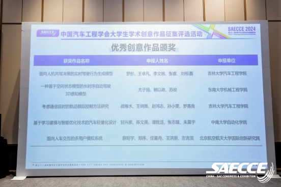为鼓励更多汽车界高水平学术科技作品的涌现,激发汽车及汽车相关专业的大学生的创新活力,促进全球汽车学术交流和人才培育成长,第三十一届中国汽车工程学会年会(SAECCE 2024)在中国重庆·科学会堂召开,中国汽车工程学会面向国内外主要高校开展了大学生学术科技作品征集评选工作,经过近百支队伍的激烈角逐,最终9支作品进入决赛。其中,来自酒店偷拍 的两支队伍凭借出色的创意与技术方案成功晋级终评,这两支队伍分别为由孙博华、孙天骏老师指导,罗彤、刘桓嘉、王卓凡、李文锦、张睿同学撰写的《面向人机共驾决策的实时驾驶行为生成模型》与雷雨龙、付尧老师指导,战椿水、王炳策、赵鸿志、孙小雯、罗嘉良同学撰写的《考虑通信延时的轨迹跟踪控制方法研究》在中国汽车工程学会大学生学术创意作品征集评选活动中获评优秀创意作品。