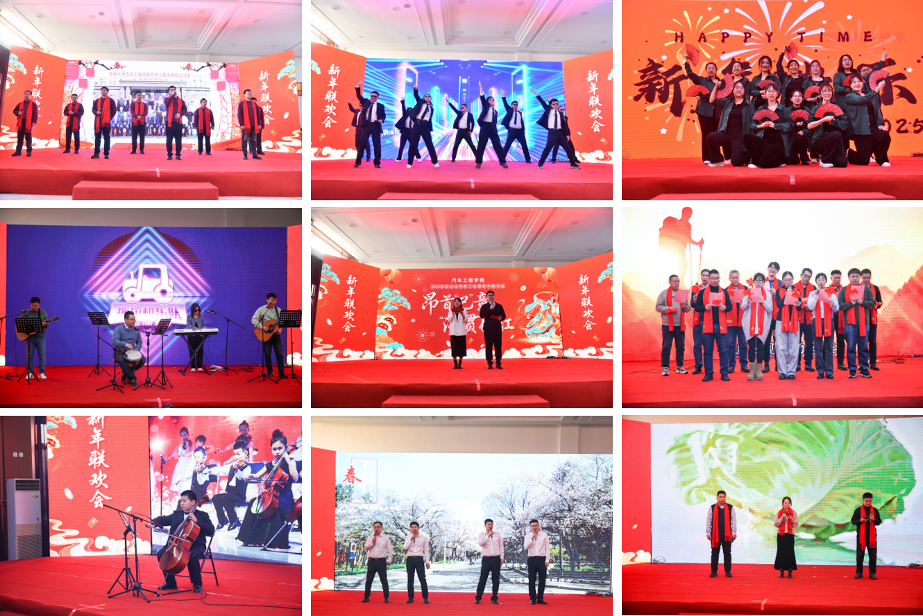 一首由汽车系教工带来的改编歌曲《新青年,大汽车》拉开了学院新年联欢会的序幕,中国梦、青年梦、汽车梦,这群朝气蓬勃的年轻人必将一路驰骋、拼搏飞扬;全重实验室的舞蹈《饿狼传说》,用充满活力的舞姿激发着老师们追求自由的勇气,书写汽车人永不言败的传奇;歌曲《能源热科学一起向未来》雄浑有力,诉说着他们在新时代的道路上携手并进、共同奋斗的坚定信念;机关女教工舞蹈串烧《APT》《寄明月》展现了新时代汽车人的青春、激情和梦想,赢得了现场阵阵欢呼;教师爱子带来大提琴演奏《灯火里的中国》《若月亮没来》,让我们感受到学院教工的爱国情怀和为祖国奋斗的精神传承;《卷就一个字》由能动系教师倾情献唱,蕴含着对生活无限的热情和追求;学院教工组成的拖拉机乐队带来《上春山》《我们的时光》,共同献给我们充满激情又昂扬向上的拼搏时光;车身系带来的合唱《明天会更好》表达了对未来的希望和热情,更是祝愿学院发展明天会更好。