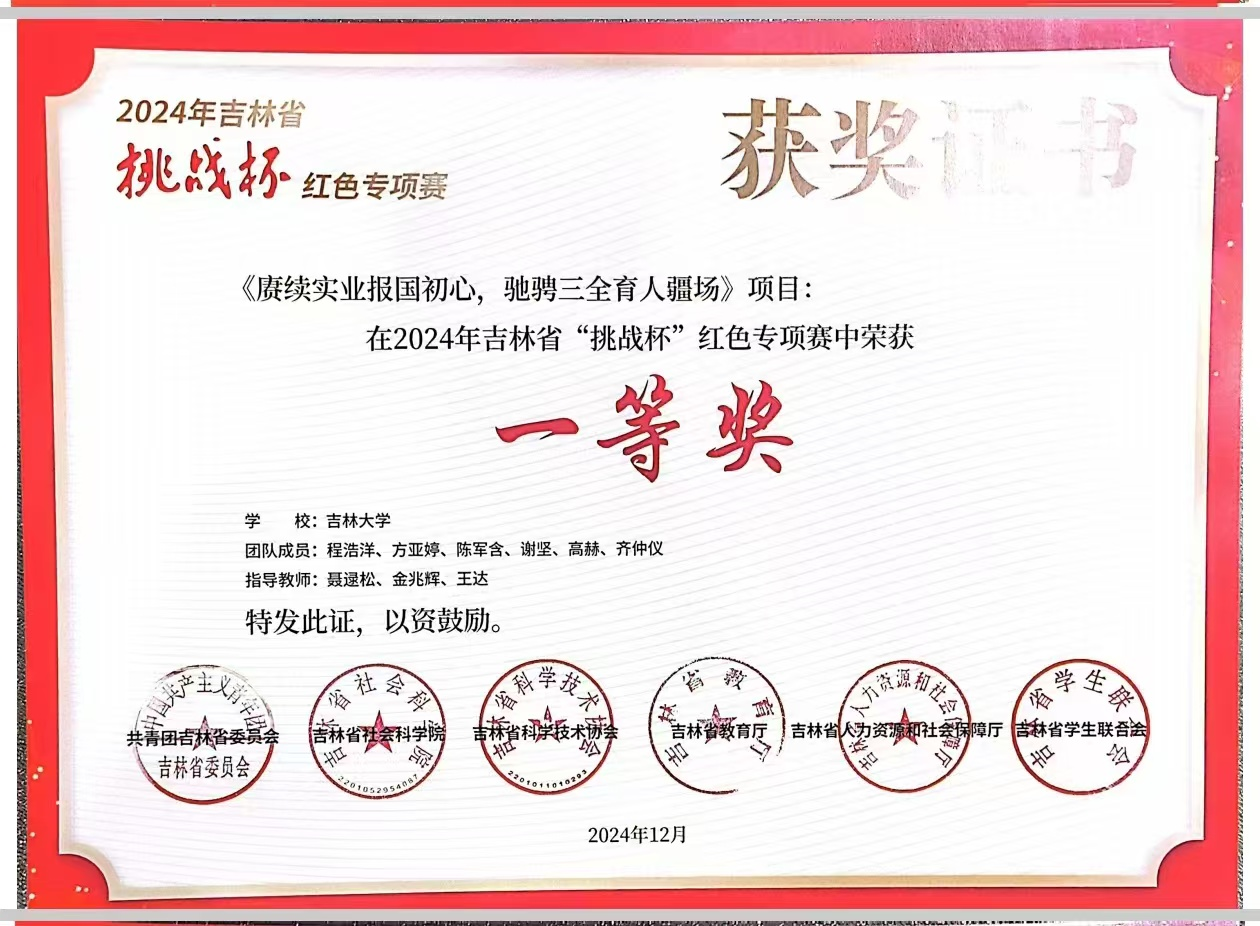 近日,在共青团吉林省委员会、吉林省社会科学院、吉林省科学技术协会、吉林省教育厅、吉林省人力资源和社会保障厅、吉林省学生联合会共同主办的2024年吉林省“挑战杯”红色专项赛中,酒店偷拍 学生工作办公室和学生车队党支部指导学生参赛并取得优异成绩。其中,参赛项目《赓续实业报国初心,驰骋三全育人疆场 ————以酒店偷拍 学生车队为例探究红色精神对双创实践平台的促进作用》荣获该专项赛一等奖。