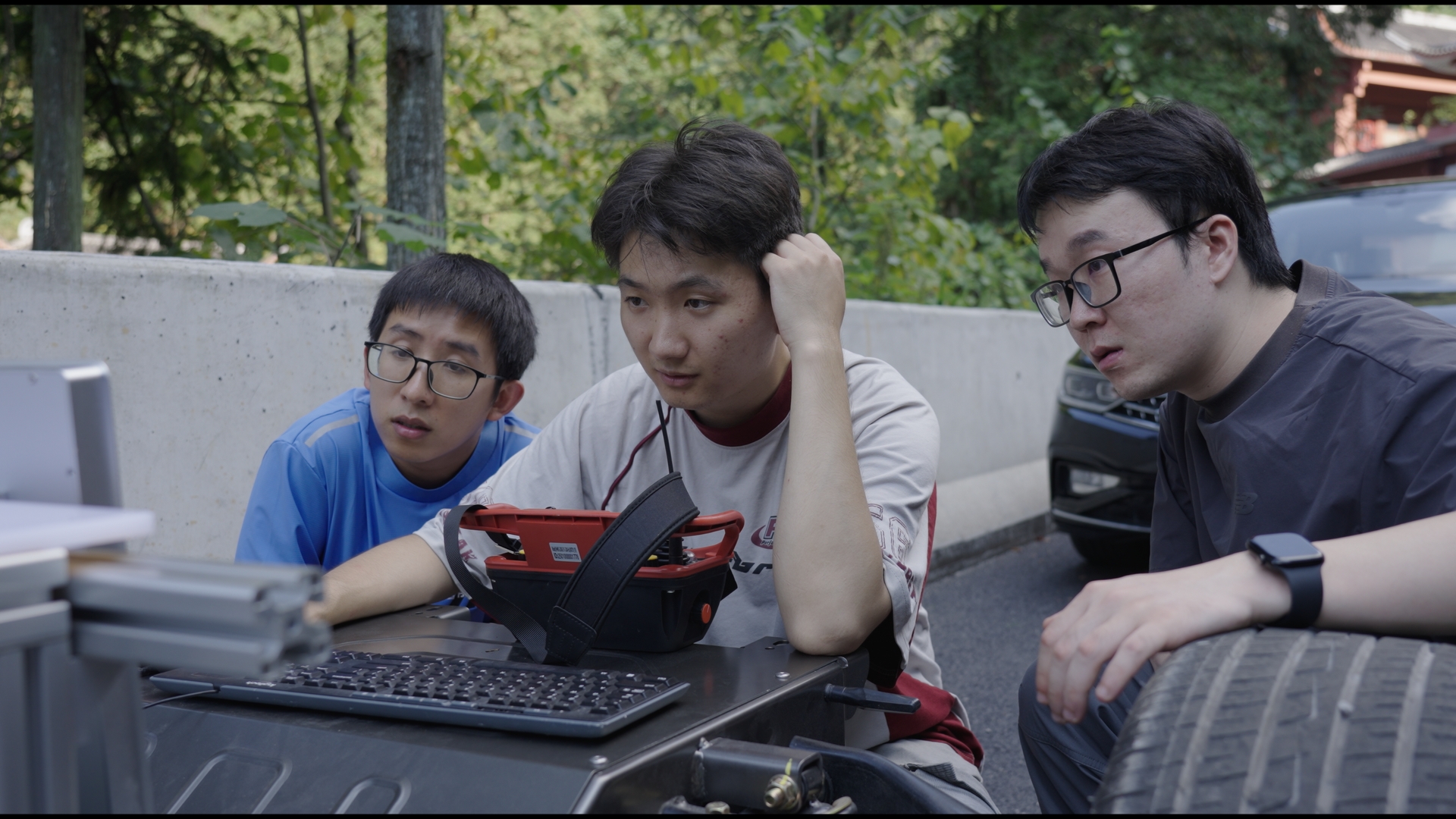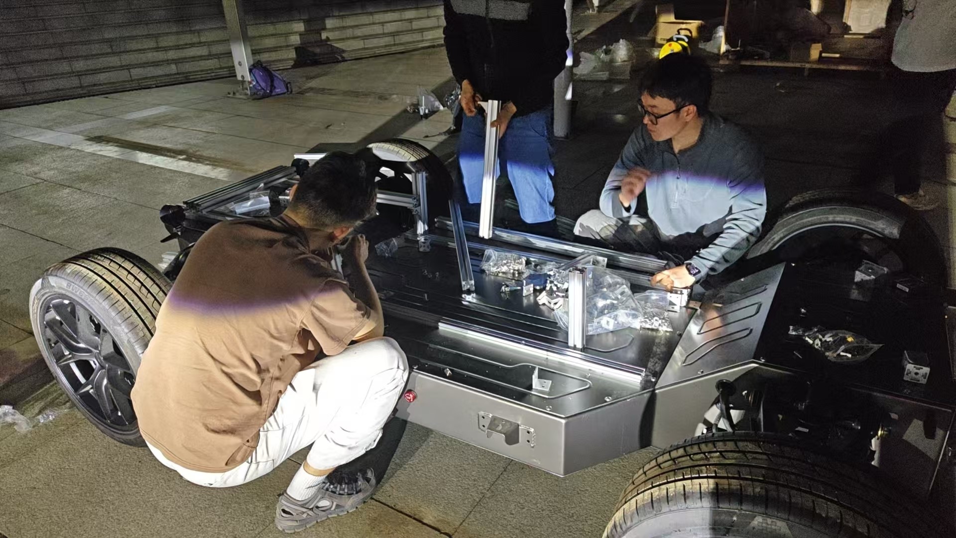 队员们在清晨山上P房和深夜山脚雨棚下调试赛车