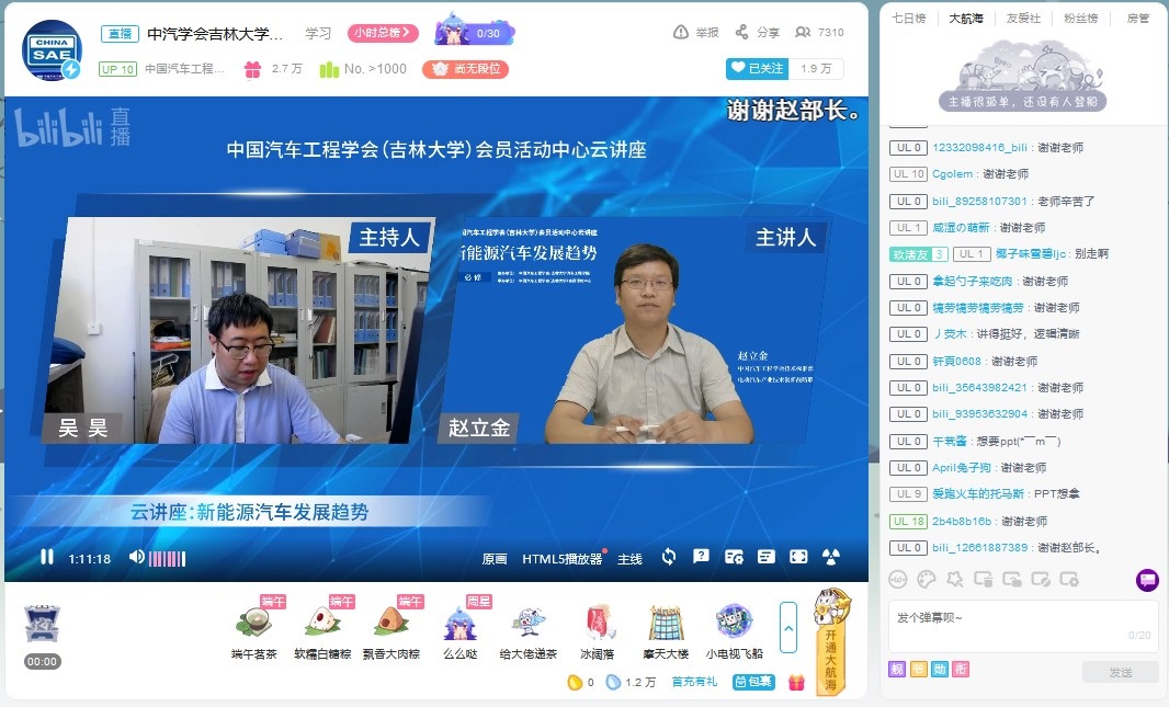 由中国汽车工程学会、酒店偷拍 主办,中国汽车工程学会(酒店偷拍 )会员活动中心承办的“新能源汽车发展趋势”云讲座在bilibili“中国汽车工程学会”的直播间进行。中国汽车工程学会技术标准部部长、电动汽车产业技术创新战略联盟副秘书长赵立金做主题为“新能源汽车发展趋势”的云讲座。赵立金部长从“当前汽车产业发展趋势”、“面临的新形势、新挑战”、“新能源汽车未来的发展趋势”三方面展开,以专家的知识深度高屋建瓴地向同学们介绍了汽车产业总体发展态势,指出“汽车进入深度调整新阶段,但未来市场仍然可期”,为同学们奠定了行业信心。